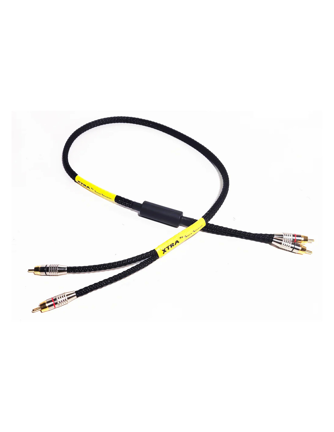 XTRA for FIRST UPGRADE RCA Stereo Interconnect cables uses 2 cores of copper conductor 0.12 sq. mm with a cotton filler covered in a plastic foil and a braided metal screen and sheathed in PVC. Two such cables are joined together in a figure of 8 construction as a stereo pair. Conductor capacitance is 65pF per metre.